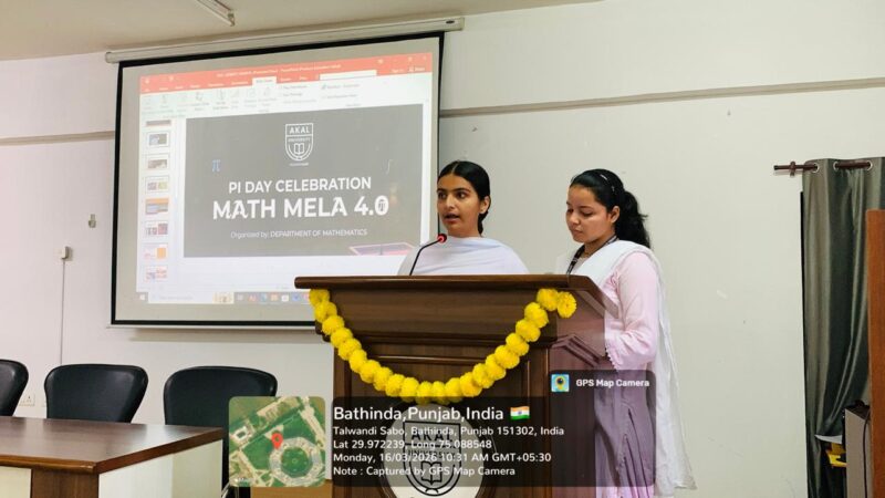 The Department of Mathematics at Akal University, Talwandi Sabo, successfully hosted Day 1 of “Pi Day and Math Mela 4.0” on March 16, 2026. This vibrant department society event witnessed the enthusiastic participation of around 200 students, aiming to foster mathematical thinking and spark curiosity among young minds.